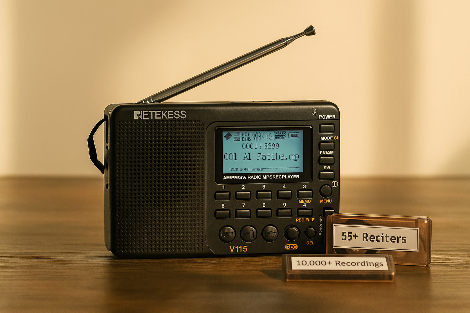 55+ renowned Qur’an reciters, including Taraweeh from Masjid al-Haram (Makkah) and Masjid an-Nabawi (Madinah). The full reciters list is shown in the product images.
